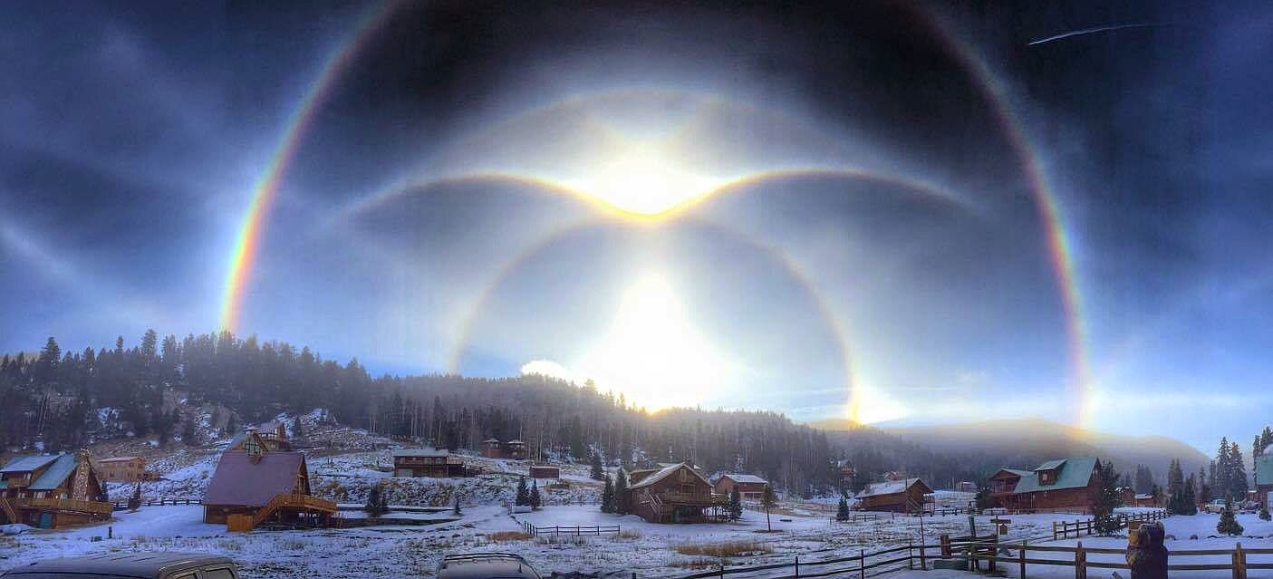 Seen from Texas and New Mexico.  I’d seen this display taken from Texas and shared it on Facebook.  Cobra describes it:  “This beautiful photo shows Parry arcs, a Sun pillar, a parhelion, a halo and additional four types of different arcs, all of them rare atmospheric optic phenomena on their own, all appearing at the same moment.”